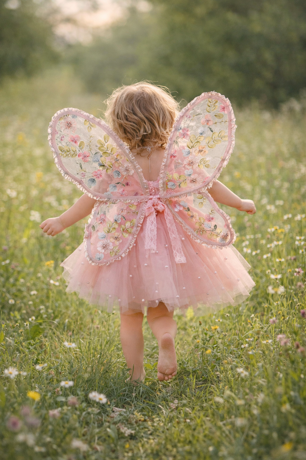 The full blush tulle skirt is light and voluminous, sprinkled with tiny pearl accents that catch the light with every twirl. From the back, the magic continues with fairy wings crafted from sheer floral-printed organza, trimmed with soft ruffles and finished with a lace-tied bow at the center for a truly ethereal look. The wings are removable.