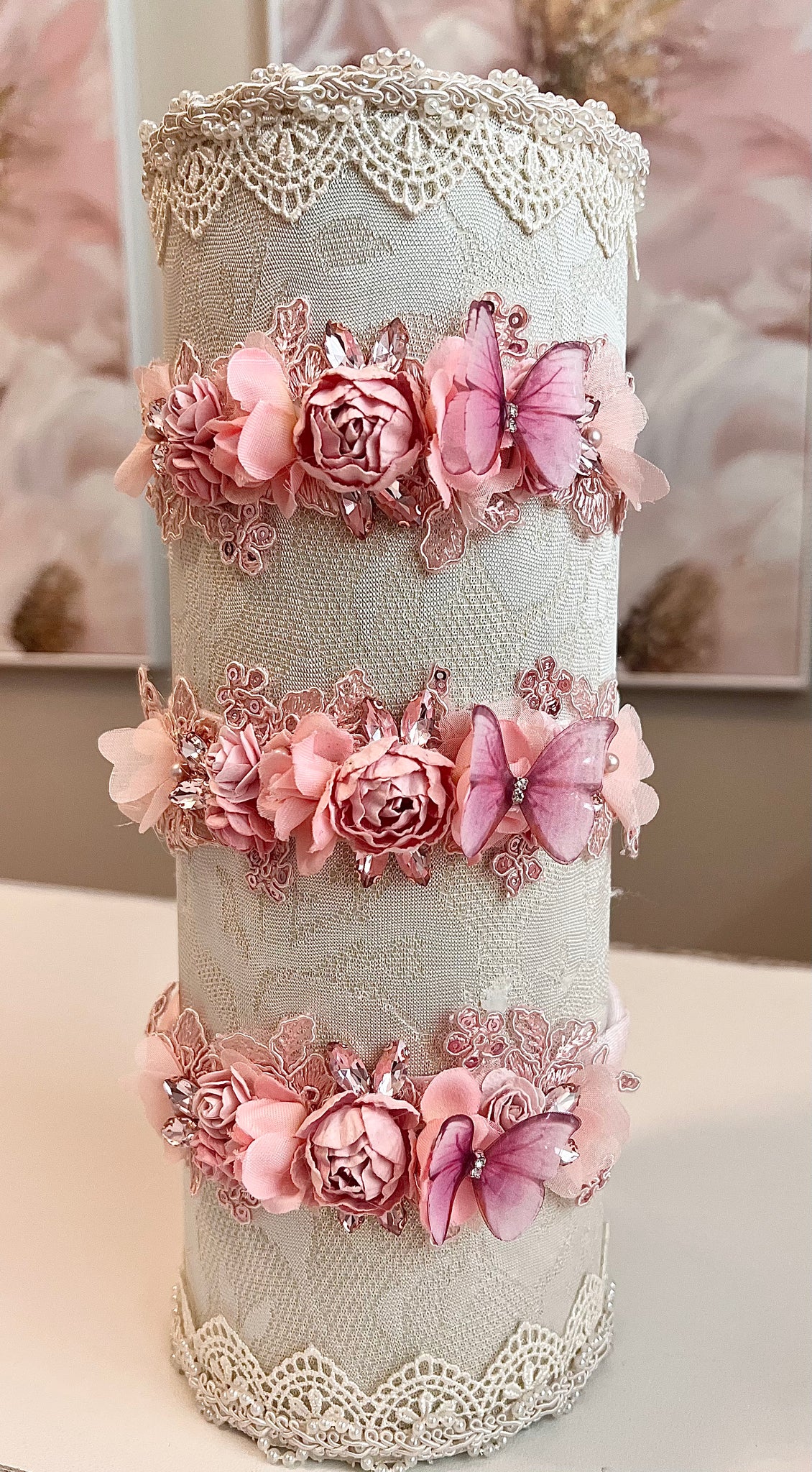 This tieback is set on a soft, blush pink stretch band. It is adorned with flowers, rhinestones and a butterfly. This headpiece has the perfect colors which makes it perfect for any studio, gift, or for your little one. This is a tieback so it's suitable for newborn up to 2 years.