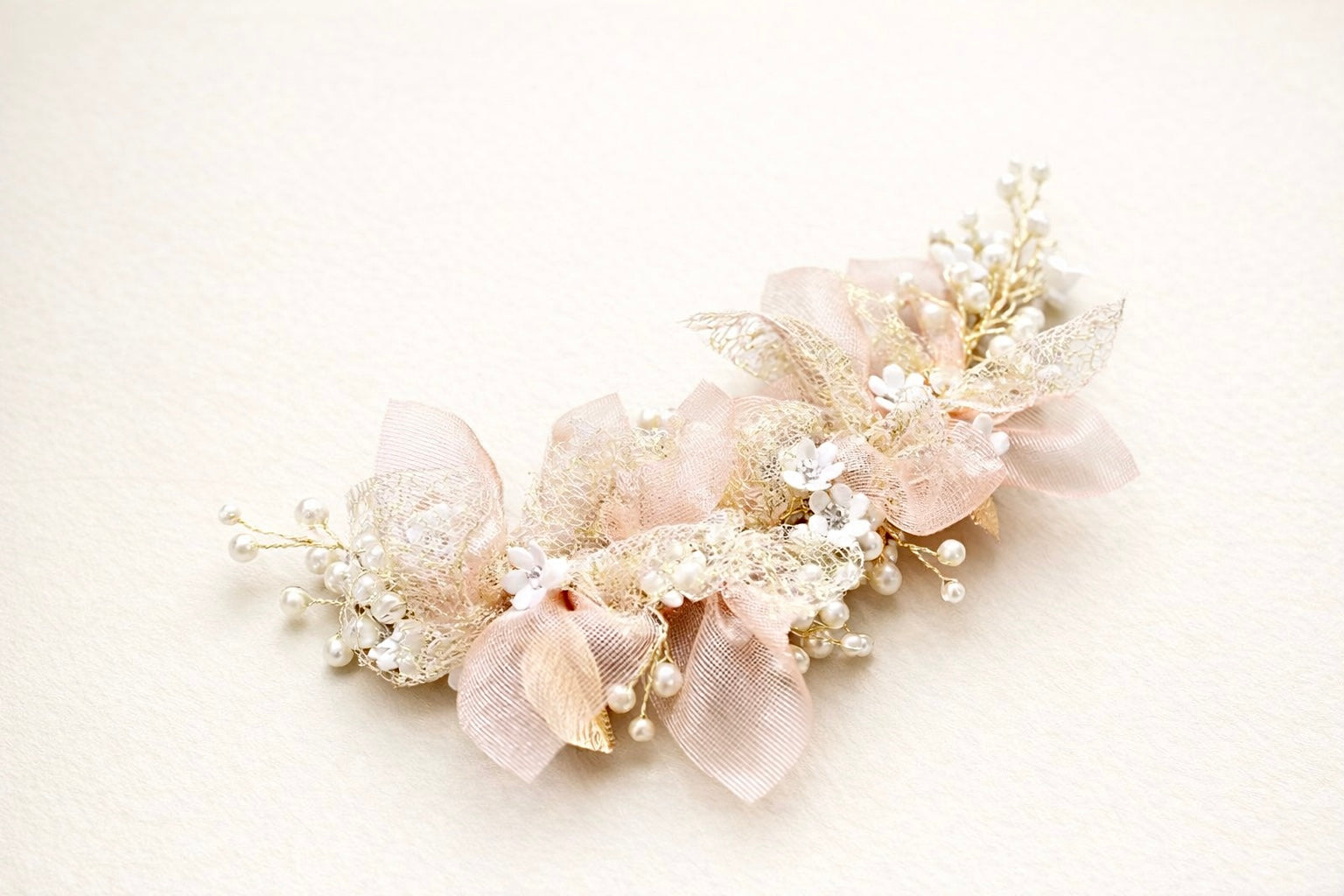 Delicately handcrafted, this blush floral headband is designed to add a touch of heirloom elegance to any special moment. Soft layers of blush tulle and fine lace petals are artfully arranged with luminous faux pearls and intricate gold wire detailing, creating a look that feels timeless.