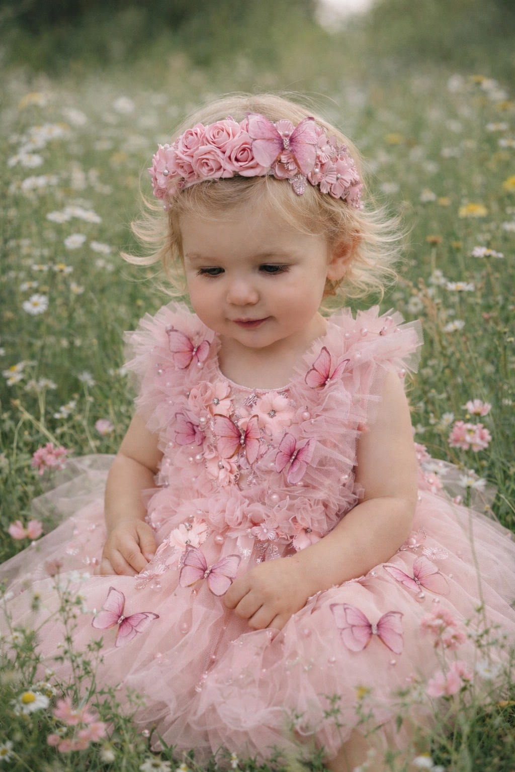 This tieback is set on a soft, blush pink stretch band. It is adorned with flowers, rhinestones and a butterfly. This headpiece has the perfect colors which makes it perfect for any studio, gift, or for your little one. This is a tieback so it's suitable for newborn up to 2 years.