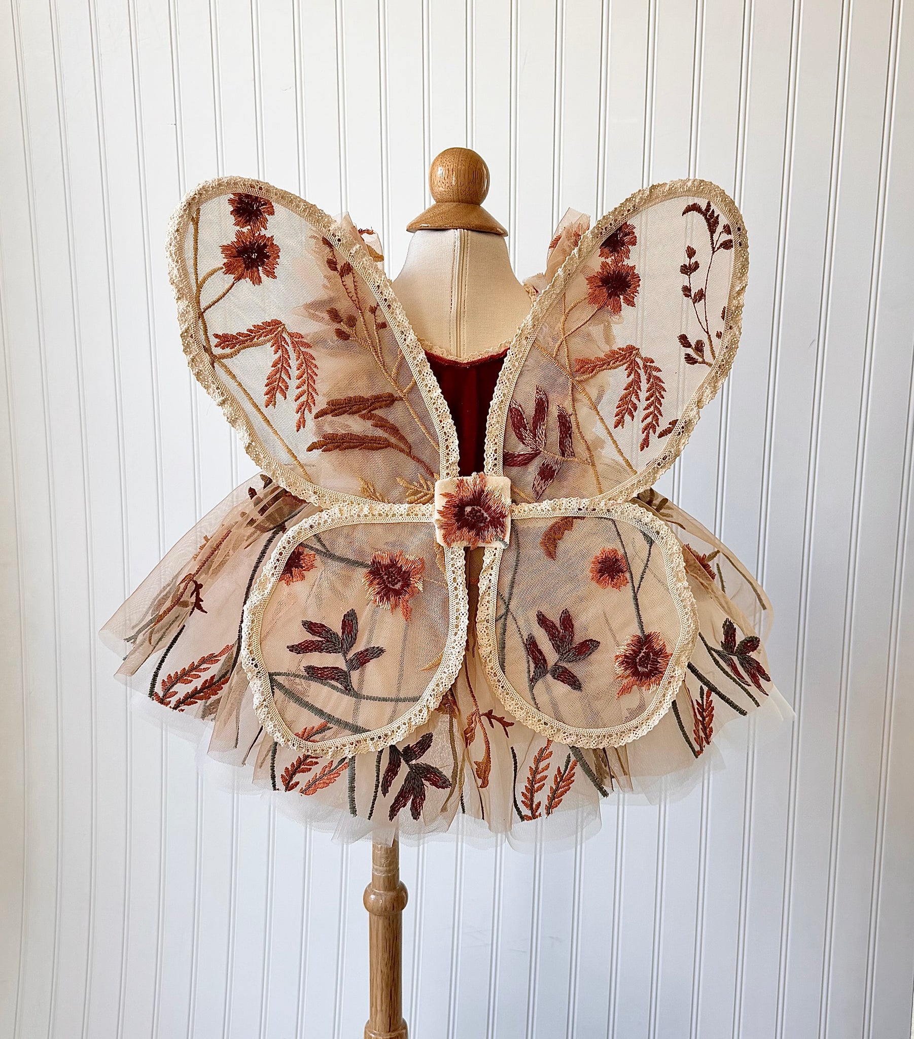 This listing is for the Burnt Orange Dress and Wings. The dress is made with a stretch burnt orange fabric, tulle and wildflower mesh. The back of the romper has a v-neck, giving it the perfect look that can be enclosed with tulle ribbon. There is an option to include bloomers (diaper cover).