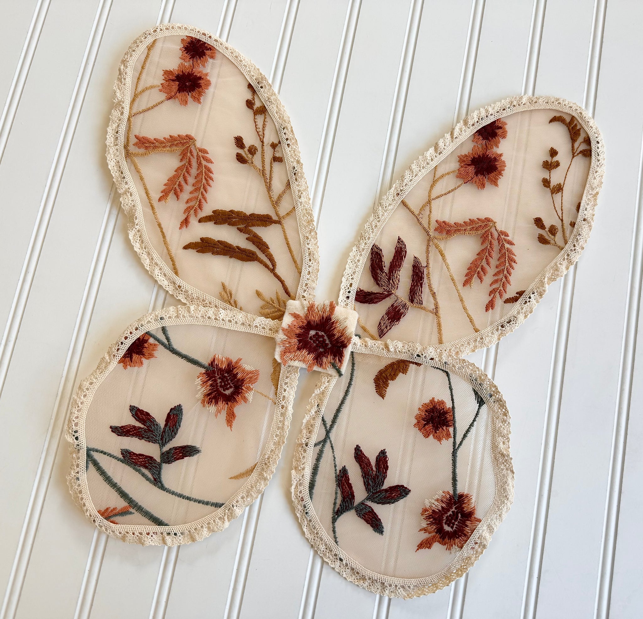 The fairy wings are lined with the wildflower fabric and have a lace border. They are removable.