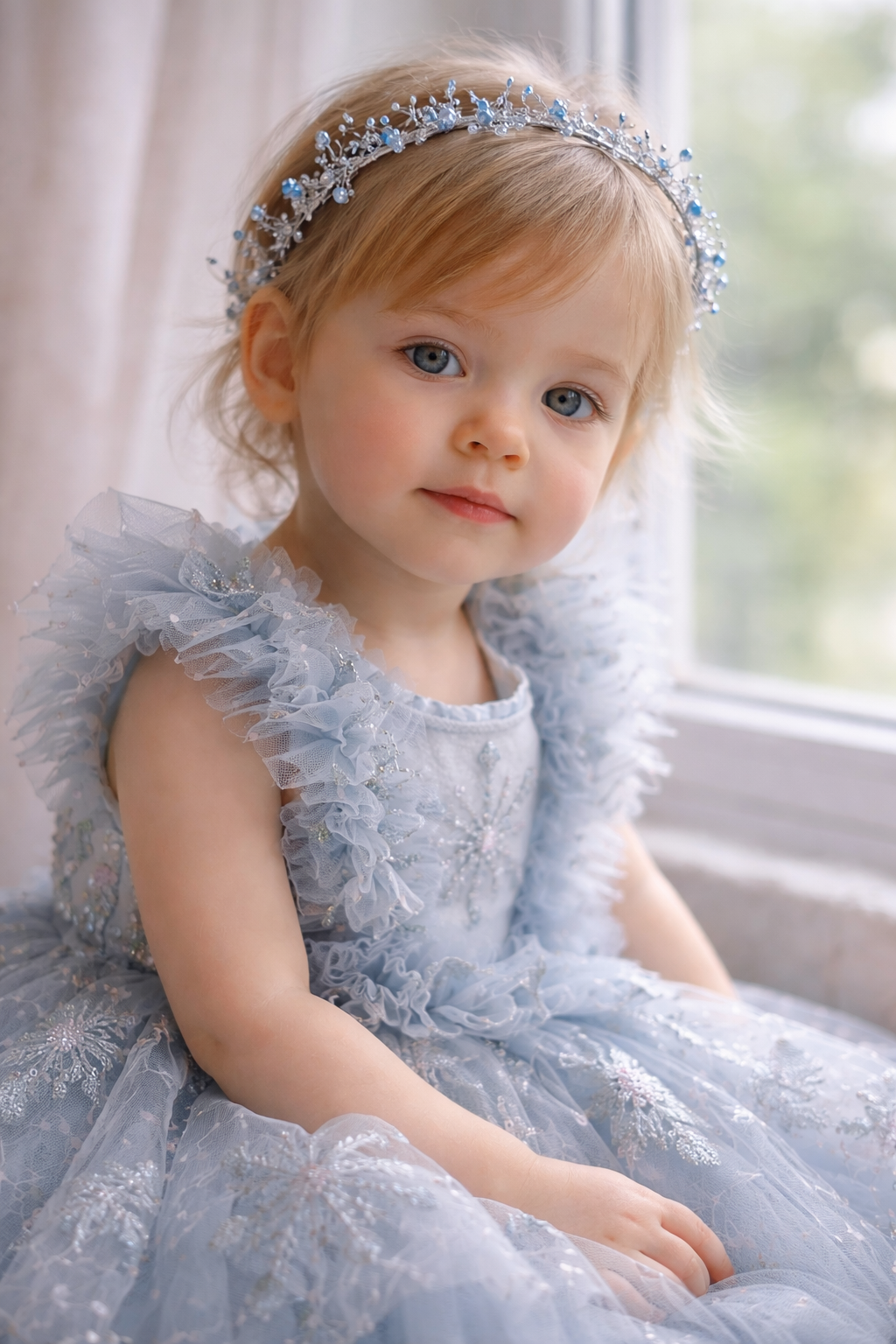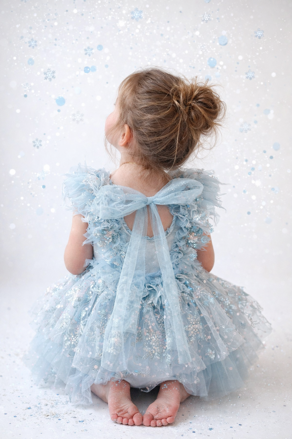 The full, fluffy skirt creates a classic twirl-worthy silhouette, perfect for winter celebrations, birthdays, holidays, photoshoots, and special occasions. Light, airy, and exquisitely detailed, this dress captures the magic of winter in the most elegant way.
